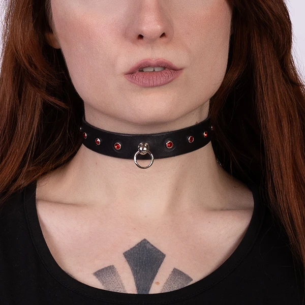 Handmade leather choker with crystals, which also has a loop for a leash. We offer the following variants of the leather choker with leash loop: