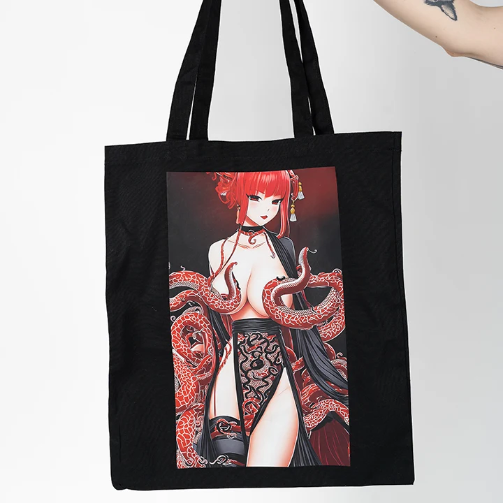 Tentacle geisha shopping bag, aka the bag with the popular tentacles. This motive comes from Japanese culture. The design was created by a Czech artist from the Czech Republic, Europe. The colour of the bag is black and the material is canvas.